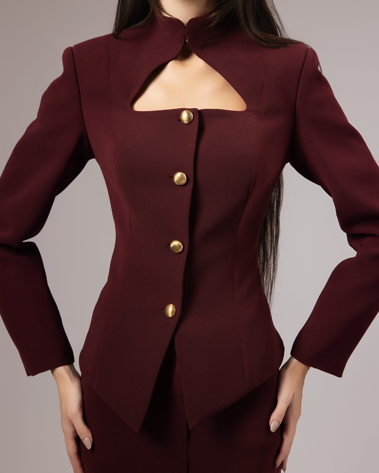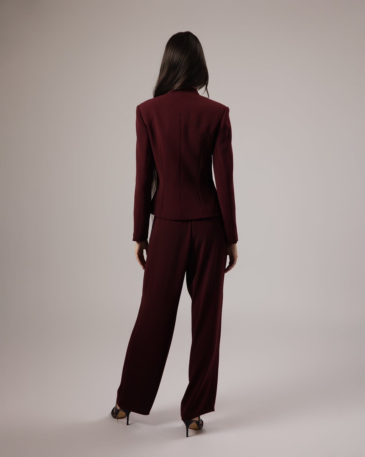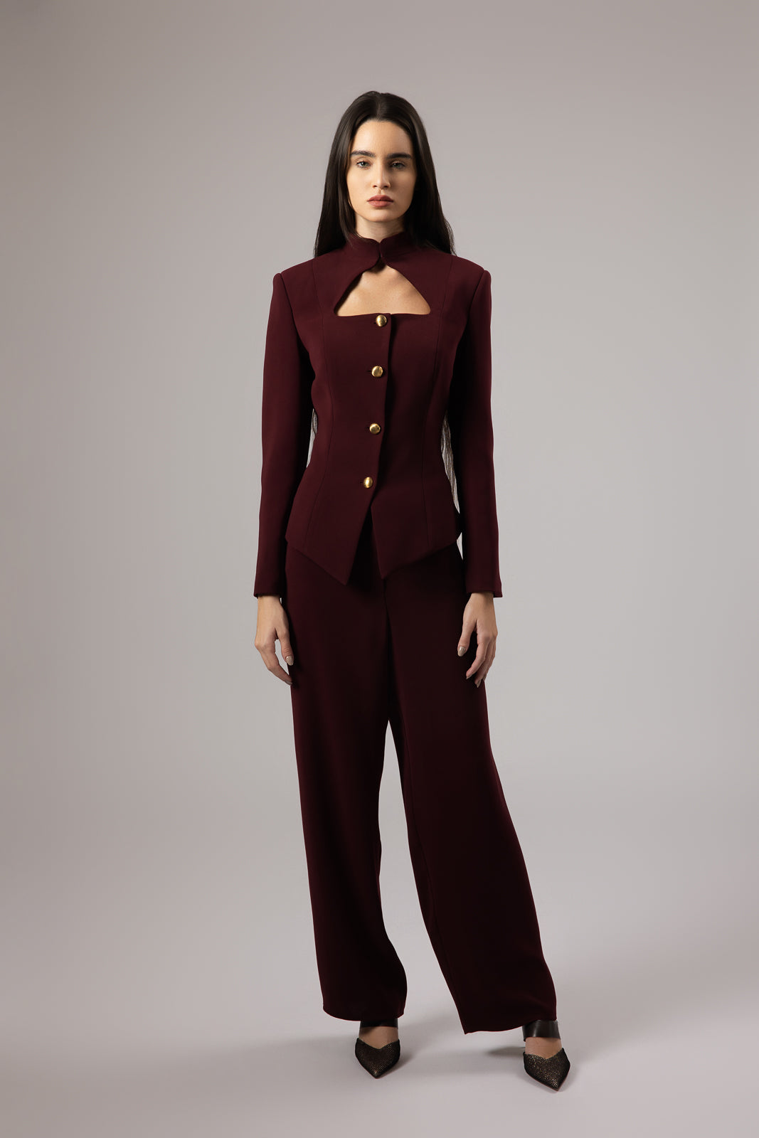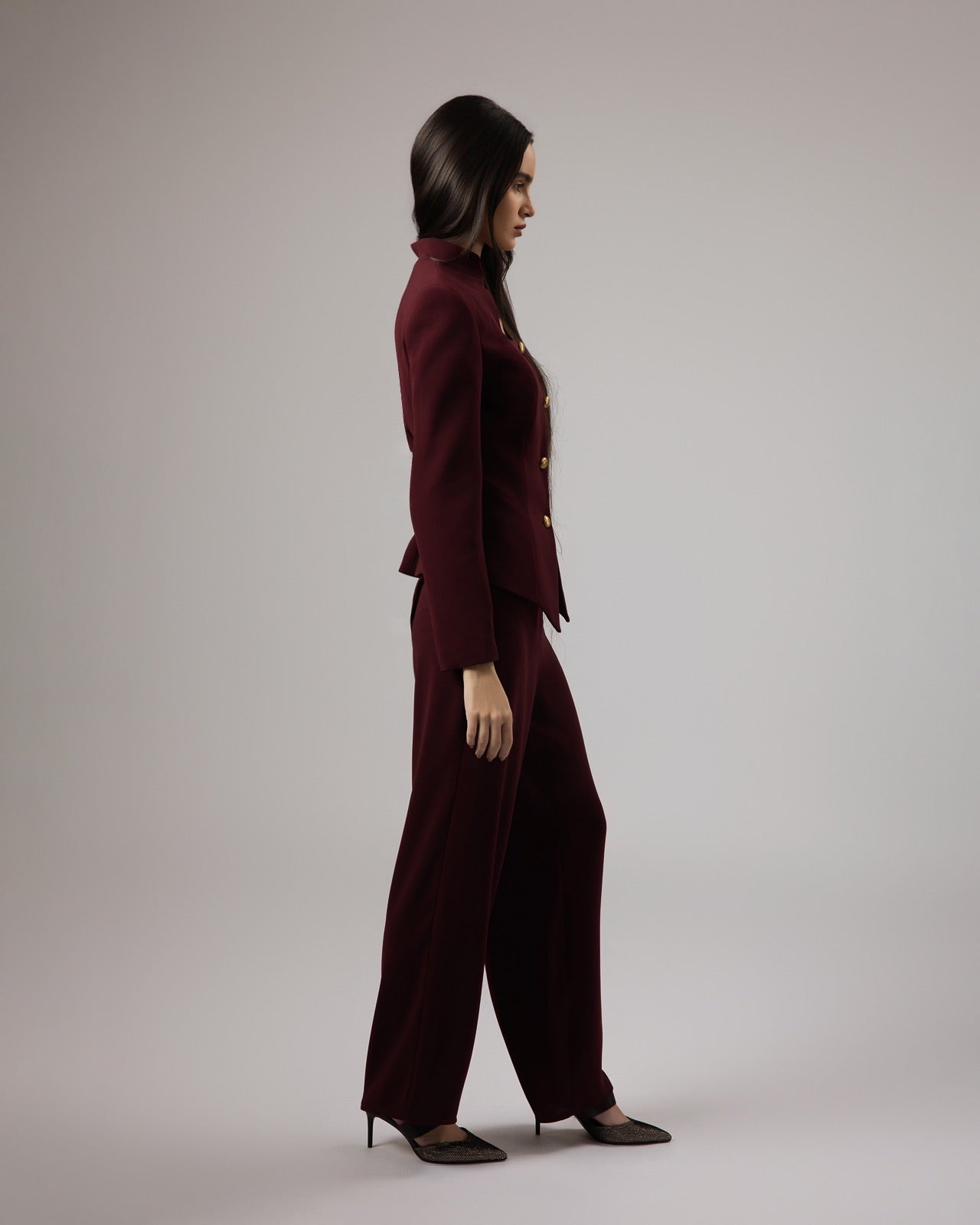 A burgundy crepe set accented with statement gold buttons. Mid waist trousers.